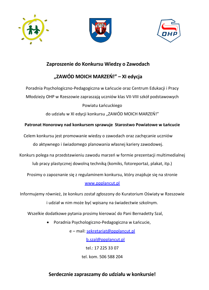 POWIATOWY KONKURS “ZAWÓD MOICH MARZEŃ” – EDYCJA XI – ZAPRASZAMY DO UDZIAŁU! 27 stycznia 202627 stycznia 2026 Drodzy Uczniowie,Zapraszamy do udziału w XI edycji powiatowego konkursu“ZAWÓD MOICH MARZEŃ”.Prace konkursowe można do nas nadsyłać do dnia 13.03.2026r.Szczegóły w regulaminie konkursu.SERDECZNIE ZAPRASZAMY !!! Pobierz regulamin Pobierz plakat